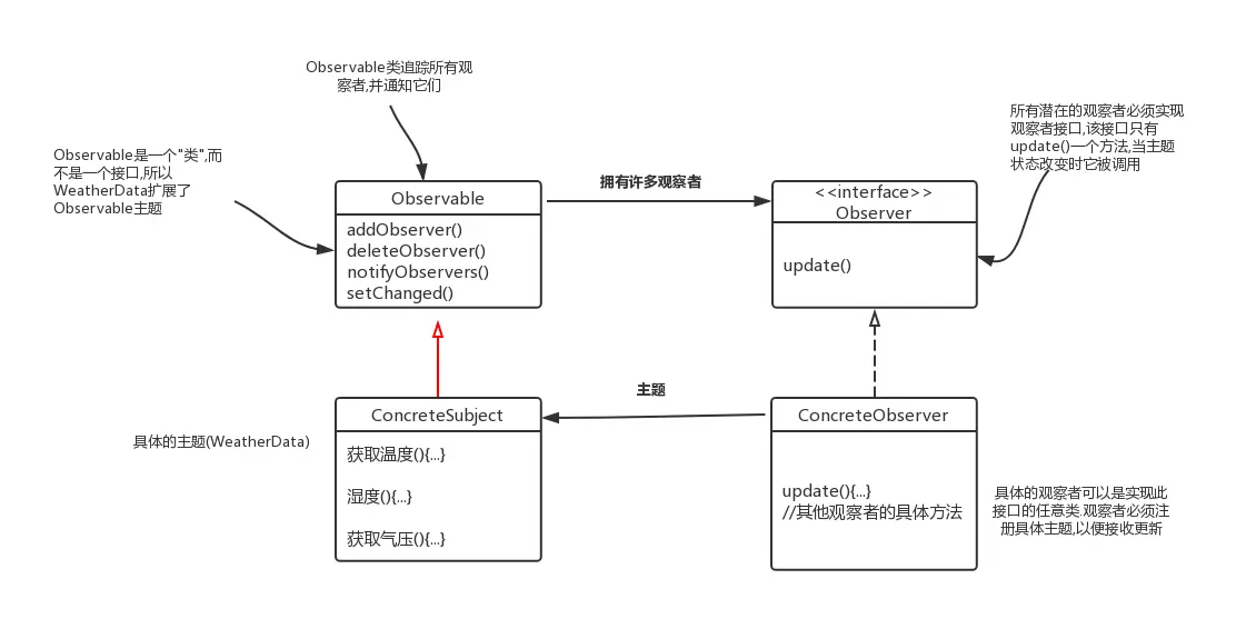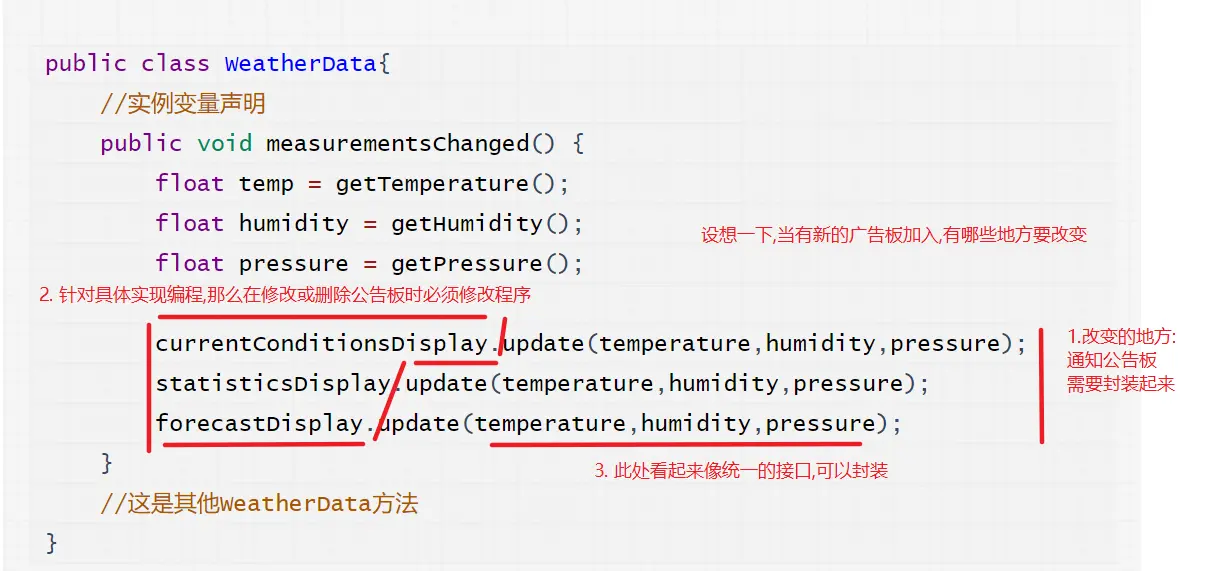 public class WeatherData implements Subject { private ArrayList<Observer> observers; private float temperature; private float humidity; private float pressure; public WeatherData() { observers = new ArrayList<Observer>(); } public void registerObserver(Observer o) { observers.add(o); } public void removeObserver(Observer o) { int i = observers.indexOf(o); if (i >= 0) { observers.remove(i); } } public void notifyObservers() { //遍历所有的观察者,调用update方法 for (Observer observer : observers) { observer.update(temperature, humidity, pressure); } } public void measurementsChanged() { notifyObservers(); } //气象站数据改变时调用的方法 public void setMeasurements(float temperature, float humidity, float pressure) { this.temperature = temperature; this.humidity = humidity; this.pressure = pressure; measurementsChanged(); } //其他的get方法 } -