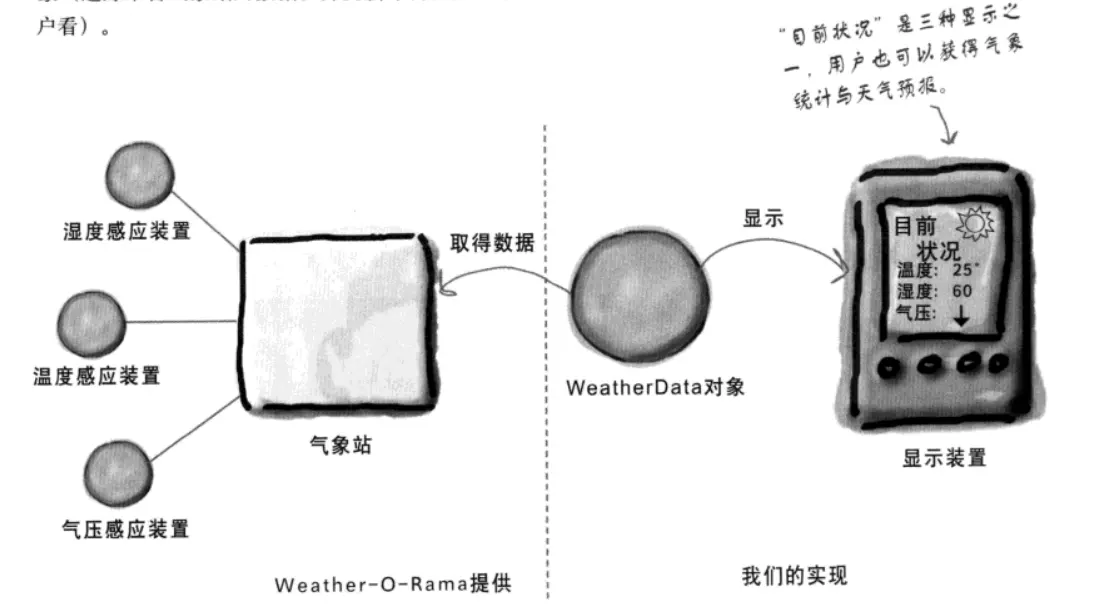 此系统中的三个部分是气象站(获取实际气象数据的物理装置) , WeatherData对象(追踪来自气象站的数据,并更新布告板) 和 布告板(显示目前天气状况给用户看.)