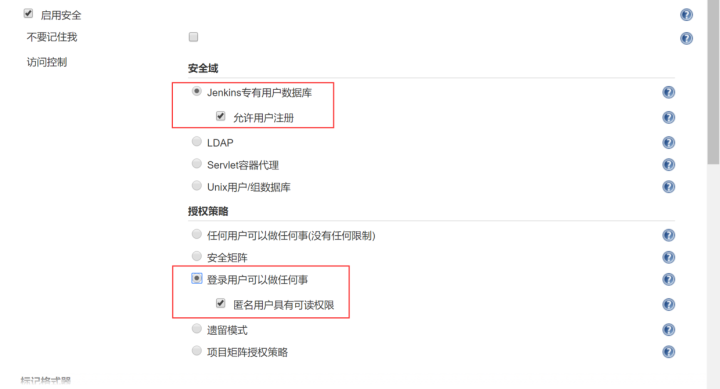 - jenkins里面有几个重要的点跨域允许访问,允许用户注册