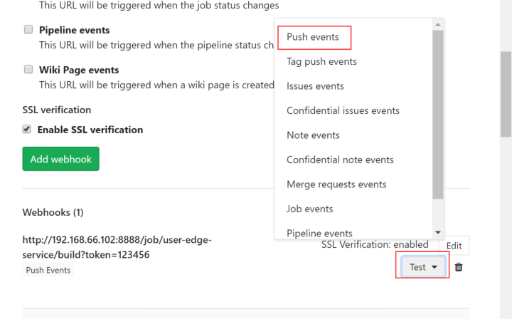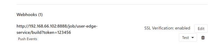 gitlab的Integrations的URL地址修改: http://192.168.66.102:8888/job/user-edge-service/build?token=123456