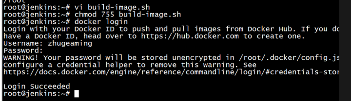 - docker login登录到docker仓库中(之前已经说过了,我的机器内存比较小,无法启动私有的docker仓库我通过的官网的,不管哪个都在jenkins的机器上登录下,push的时候就不报错了)