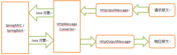 在Spring的处理过程中,一次请求报文和一次响应报文,分别被抽象为一个请求消息HttpInputMessage和一个响应消息HttpOutputMessage。