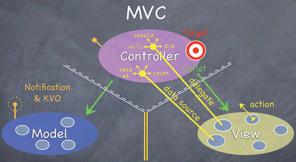 Controller 可以直接与 View 对话,通过 outlet,直接操作 View,outlet 直接对应到 View 中的控件,View 通过 action 向 Controller 报告事件的发生(如用户 Touch 我了)。Controller 是 View 的直接数据源(数据很可能是 Controller 从 Model 中取得并经过加工了)。Controller 是 View 的代理(delegate),以同步 View 与 Controller。