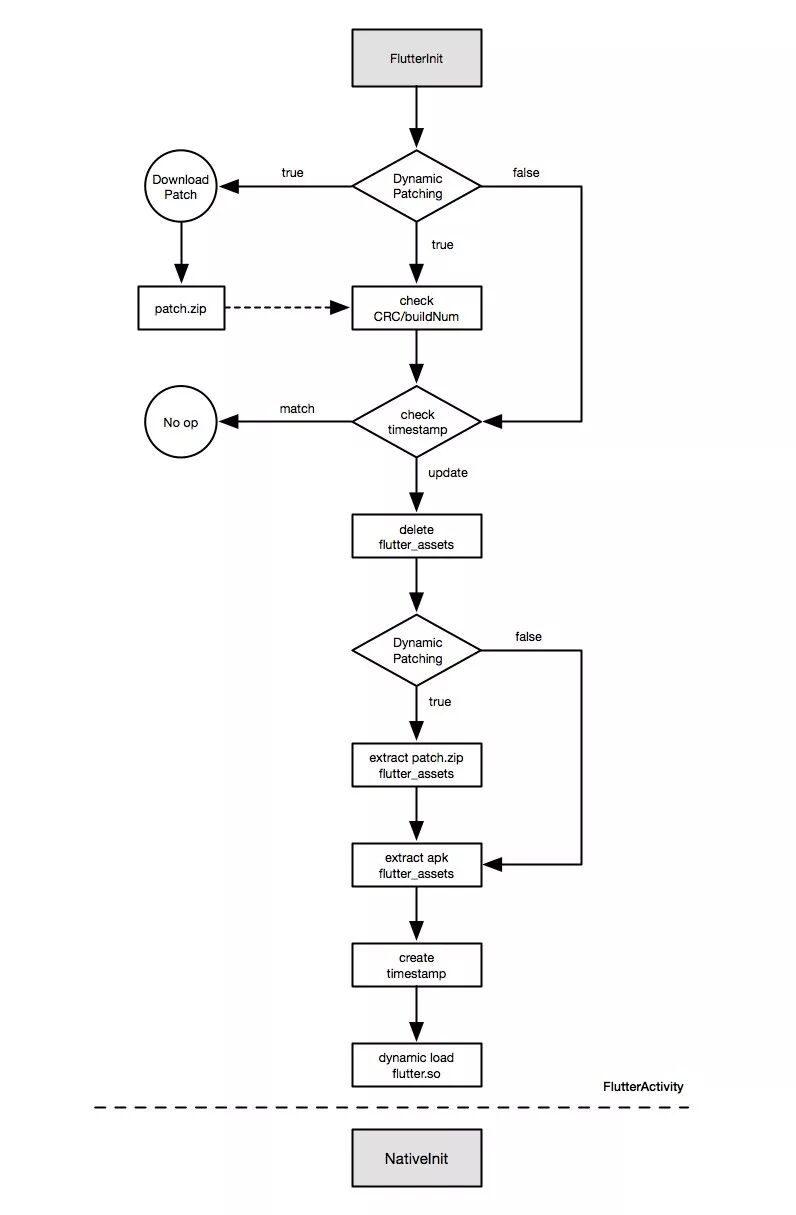 而Flutter对于自定义动态化流程,并未给出对应接口实现,如:Patch下载、校验规则、Patch替换等,所以对于使用我们自己的自定义的动态化流程,需要尽量不改动源码,保证侵入性最小,官方给出了一个metadata的配置来关闭或打开Patch的更新功能DynamicPatching,首先关闭这个,不使用内部的动态更新Patch逻辑,其次,对于动态替换,保持让Flutter先执行初始化替换流程,而自定义的这套的动态替换流程在FlutterMain init之后进行初始化或配置,进而进行资源的替换更新,而flutter.so的加载过程还在内部,这段需要屏蔽,从而动态加载我们下发的Flutter引擎,自定义的动态化加载方案一些流程和校验规则是可以参考官方实现