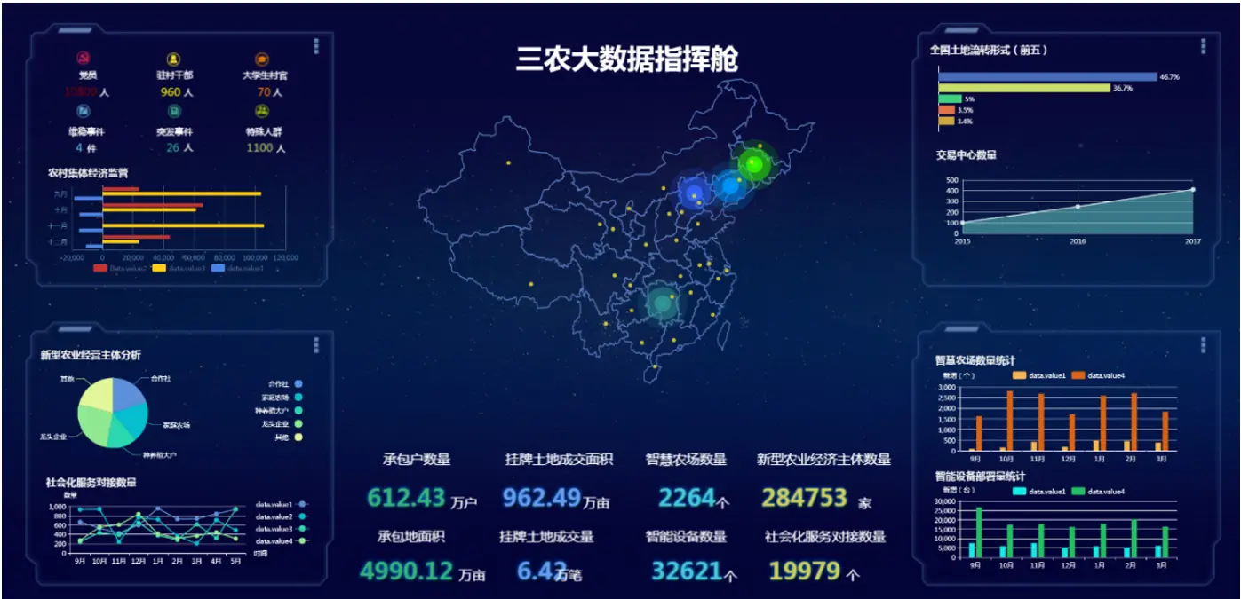 大屏幕报表提供了多种形象美观的图形报表,包括柱状图、折线图、饼图、雷达图、测量图、树图、漏斗图、矩形树图、太阳树、地图,丰富了炫酷的动态统计图,真心感觉不错。
