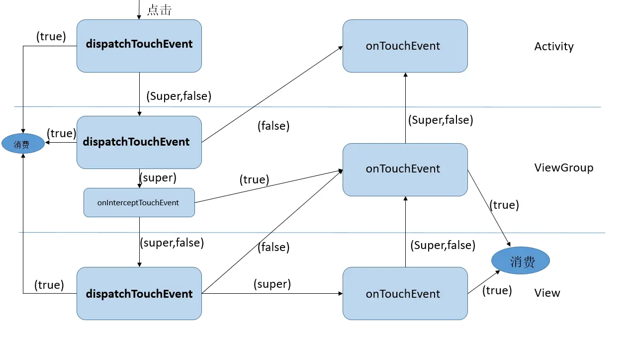 对于ViewGroup来说,当一个事件传递到它这,那么则会调用dispatchTouchEvent这个方法,系统会询问它是否要对此事件进行拦截,如果拦截,则回调其的onTouchEvent方法,如果不拦截,则往下传递给子View,调用子View的 dispatchTouchEvent方法,这样一来,事件就用当前View传递给了子View.