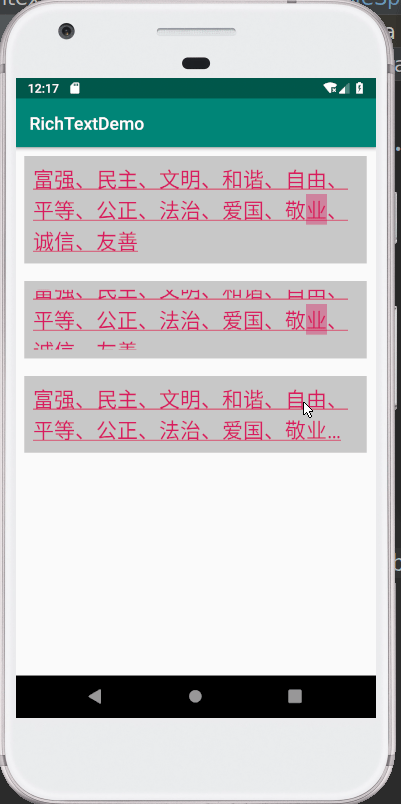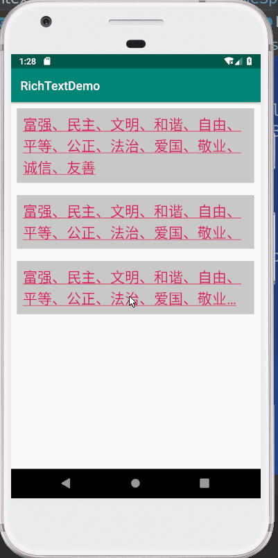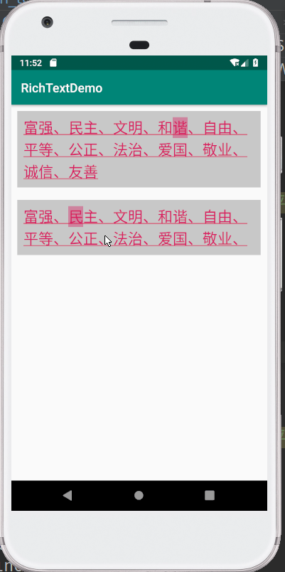 LinkMovementMethod在处理点击事件时没有做边缘判断,得到的点击位置结果可能不准,因此要自己手动处理这些边界的问题,经过反复实验,总算解决了这个问题,先来看下效果。