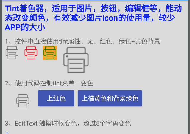 tint翻译而来就是着色(颜色渲染),就是在一张图的图层上刷颜色而达到不同效果,一个显著的好处就是,一个简单的icon图标使用,不再需要美工做多张不同颜色的,直接用着色器多一张icon着色,就有好多张不同效果的icon图片了,可以显著减少apk体积。