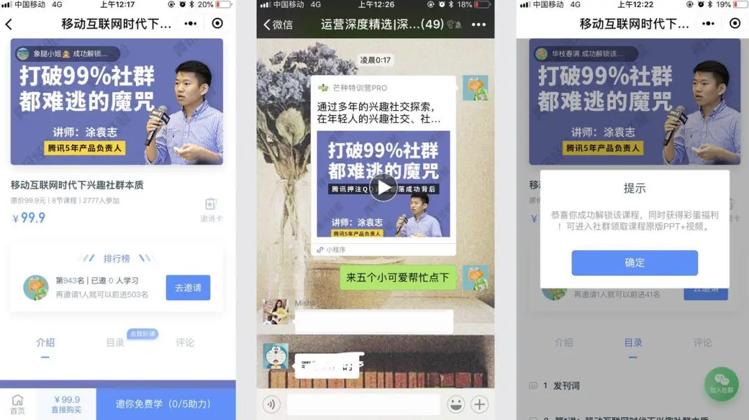 助力解锁的形态用于拼团、电商中,上图是一个知识付费的商品购买页。通过邀请用户,免费获得课程学习机会。