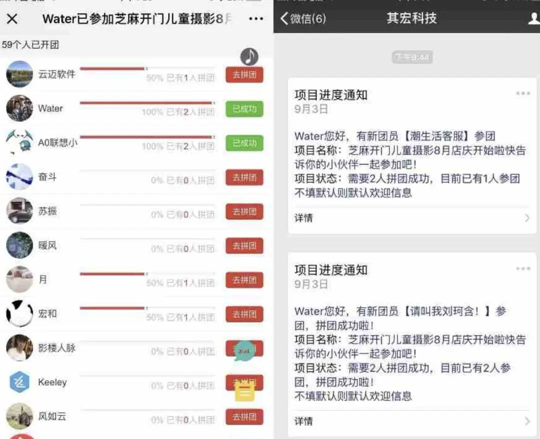 这种模型除了知识付费外,逐渐成为主流的社交电商也是利用微信生态的社群进行助理拼团。通过邀请更多人参与拼团降低产品价格,并且还有拼团排行榜。通过小程序消息模版及时提醒商品的价格变动趋势、拼团人数变化。如下图