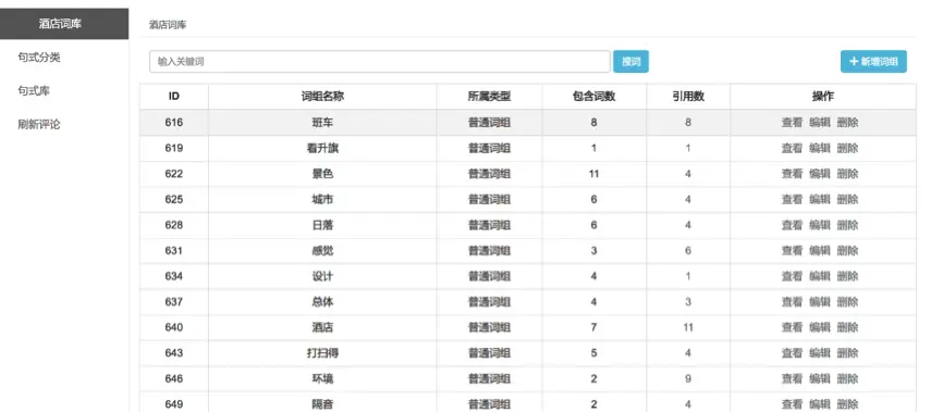 对于未被匹配的子句进行自动产生句式处理,使用内容分类,句法分析,依存分析,词义分析等方法自动产生标签分类和每个分类下的句式,用户可以对这些标签句式审核和调整。并可对已有词组推荐近义词等,丰富词组的词语数量。