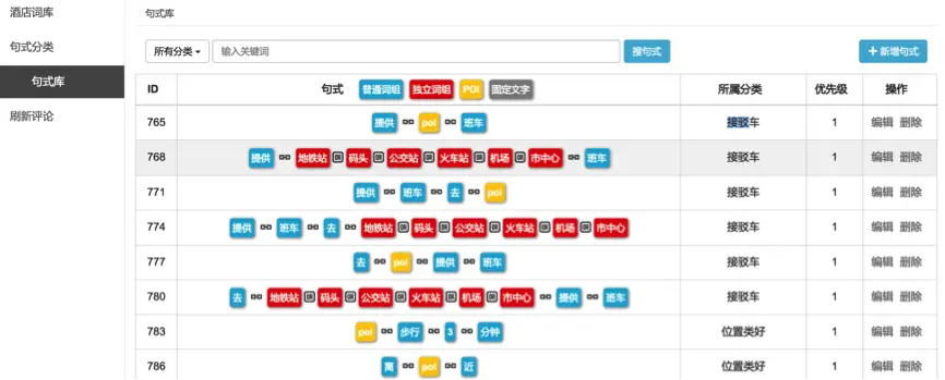 比如“服务好”类,代表所有描述服务好的评价信息,该标签类别由多个句式组成,例如“{老板}{热情}”,“{前台}{专业}”,表示的都是关于酒店和民宿服务这一类评价的句式,则这些句式产生的标签都会归属到相同的类型上,但不同业务的 UGC 产生的具体标签会各具特色。