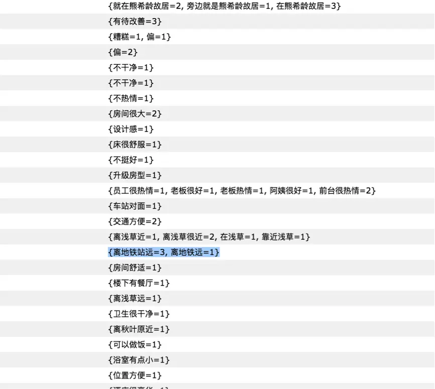 标签类别:同样,我们先简单理解成是对同一类句式,也就是一类“评价”的集合,比如上述句式包含在“交通方便”这类评价里。