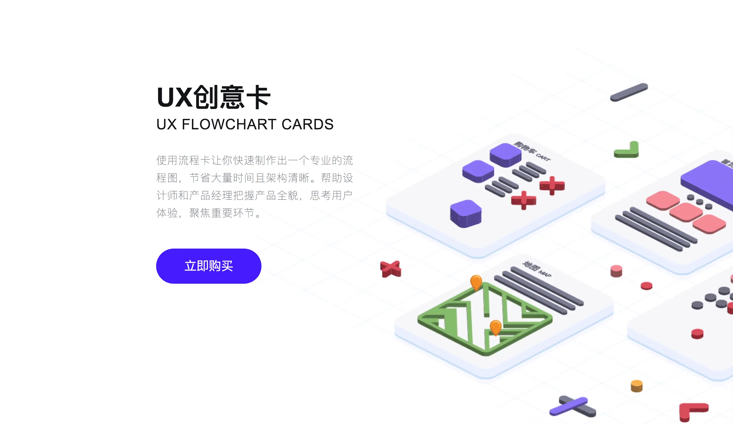 这款卡牌可以配合白纸板和笔的直接交互,这样可以省下用笔画出又线又框的时间,UX流程图卡任你搭出无数想法