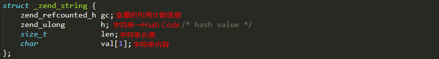 val并没有使用char*类型,字符串分配时是类似这样操作的:malloc(sizeof(zend_sting)+字符串长度),就是会多分配出一些内存来存储字符串内容,这块多出来的内存起始位置就是val。