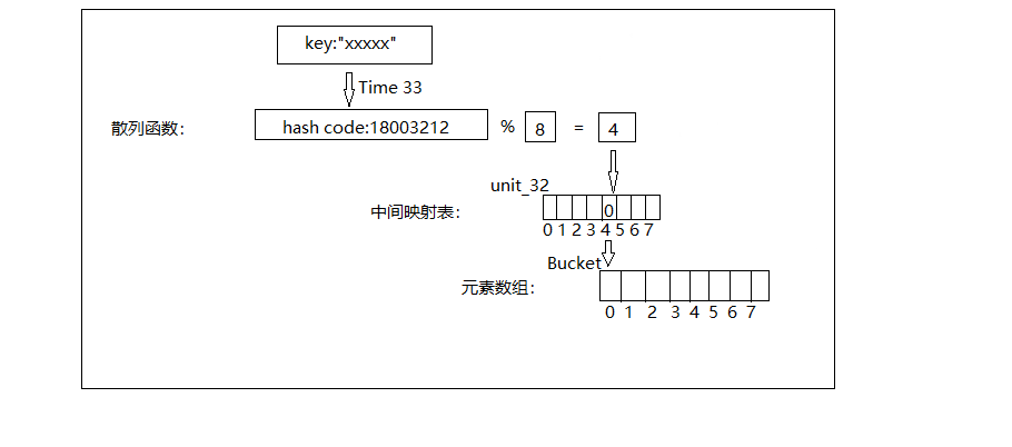 解决方法:把冲突的Bucket串成链表,即中间映射表映射出来的是一个Bucket链表,而不是一个Bucket,查找时需要遍历这个链表,逐个比较key,从而找到目标元素。