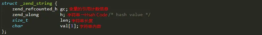 val并没有使用char*类型,字符串分配时是类似这样操作的:malloc(sizeof(zend_sting)+字符串长度),就是会多分配出一些内存来存储字符串内容,这块多出来的内存起始位置就是val。