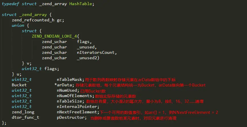 nNumUsed、nNumOfElements:当删除数组元素时并不会立马从数组中删除,而是将这个元素的类型标为IS_UNDEF,只有在数组容量超限,需要扩容时才会删除。