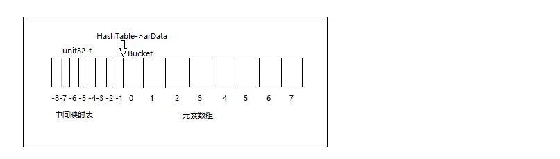 在PHP数组的结构中并没有发现这个中间映射表,事实上,它与arData放在一起。在数组初始化时,同时分配用于存储Bucket的内存和分配相同数量的uint32_t大小的空间。然后将arData偏移到存储元素数组的位置。
