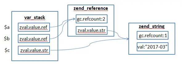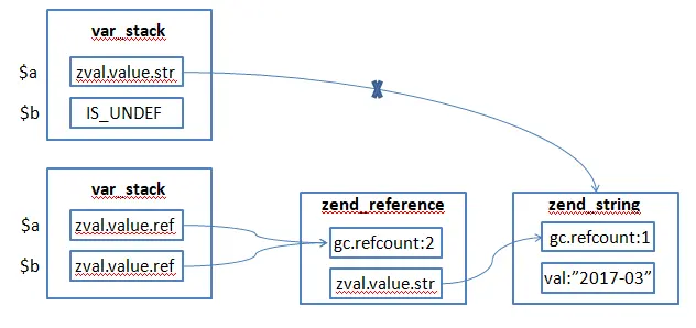 $a为字符串,通过&$a将其转化为引用类型并赋值给了$b,转换后的$a的类型由IS_STRING变为IS_REFERENCE,$a的value也转变为zend_reference结构,这个结构指向原来的字符串。