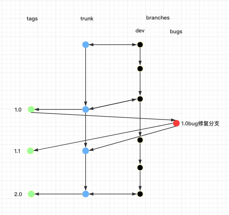 - tags:标签分支文件夹,用来存放发版本的分支,每发一个版本打一个tag分支放在这个文件夹,以后线上这个版本有bug的话,可以单独对这个分支修改bug,然后上线修复bug之后的小版本更新。