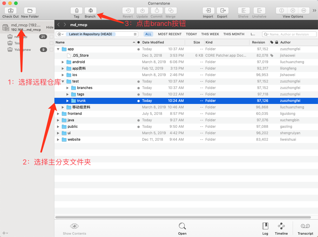 - branches:分支文件夹,用来放个人创建的分支,或者bug修复的分支,一般开发分支都放在这个文件夹内。