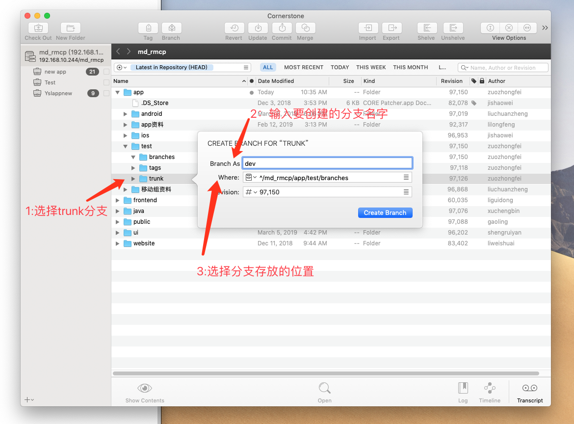 在我们团队开发中,我们在branches文件夹中创建一个dev分支,所有人都在dev分支中进行开发工作,每天更新提交代码,在一个功能开发基本稳定之后,将dev分支代码marge到trunk分支中。在发版之后,创建一个tag分支放到tags文件夹中。
