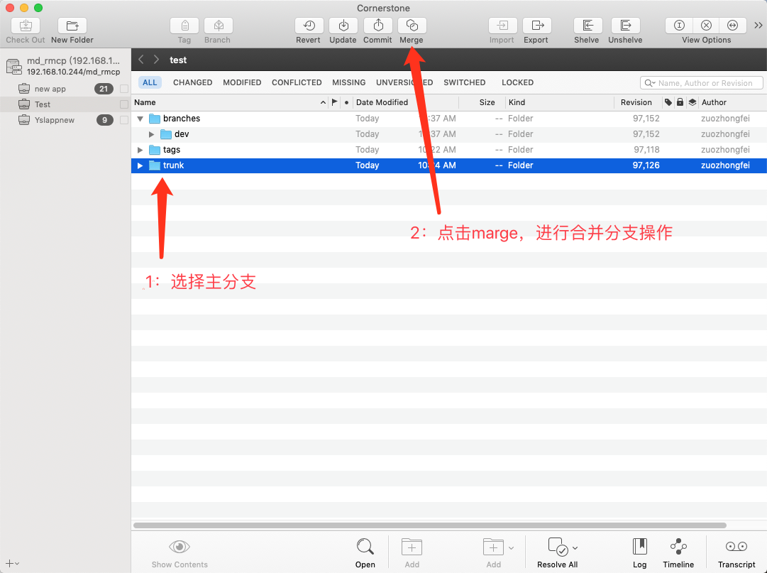 在dev分支上的开发测试稳定运行之后,就应该合并到trunk分支上去,让trunk分支保持有最新稳定运行的代码