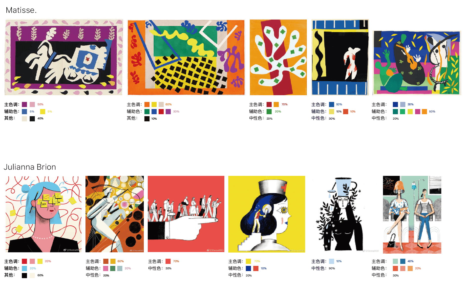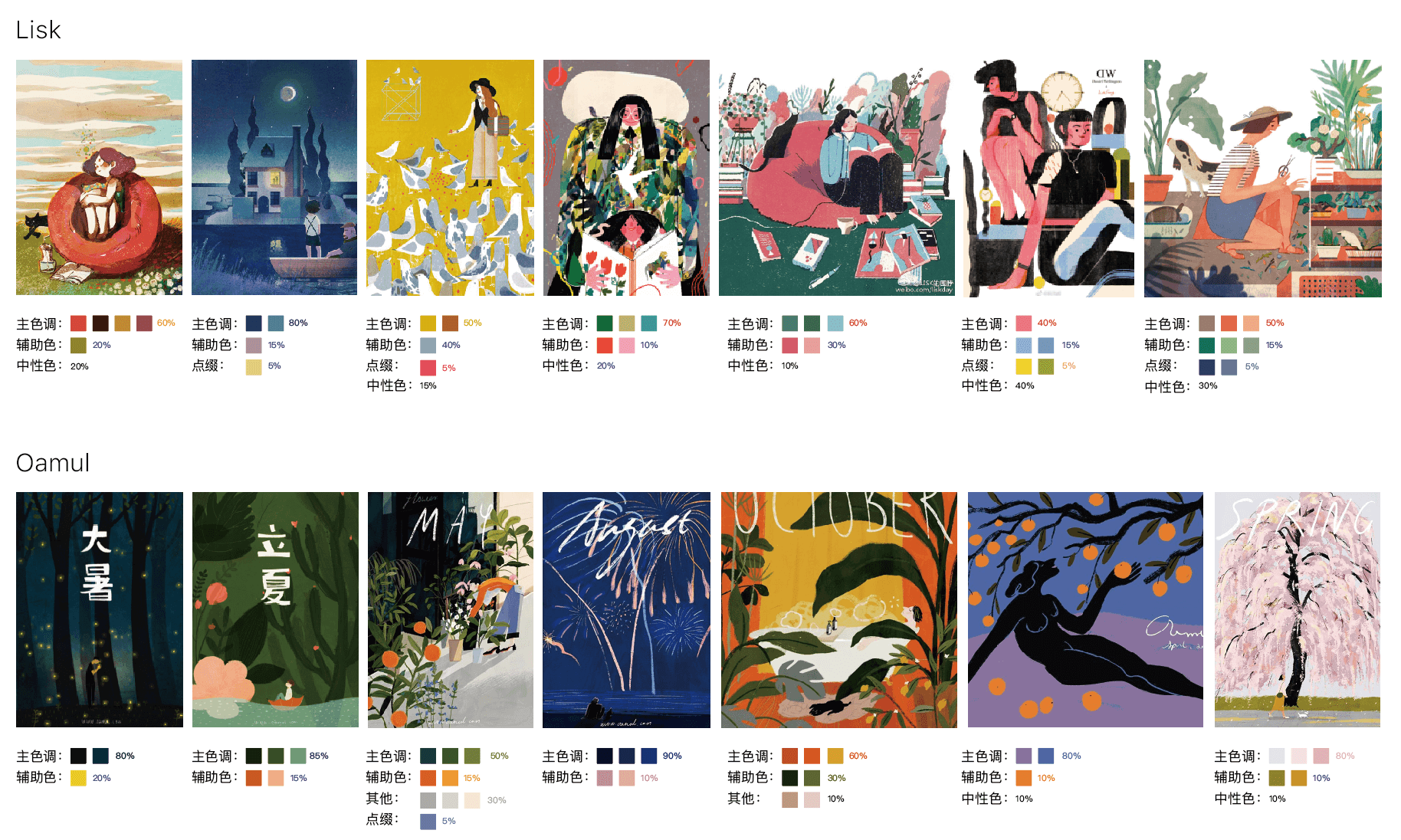 因此,我开始去找那些真正在插画领域非常出众,而且现阶段我非常喜欢的插画师,看他们在配色上是什么样的一个规律。先把自己喜欢的插画师列出来,再从中挑选自己最喜欢的10名插画师,分析他们的风格和颜色。