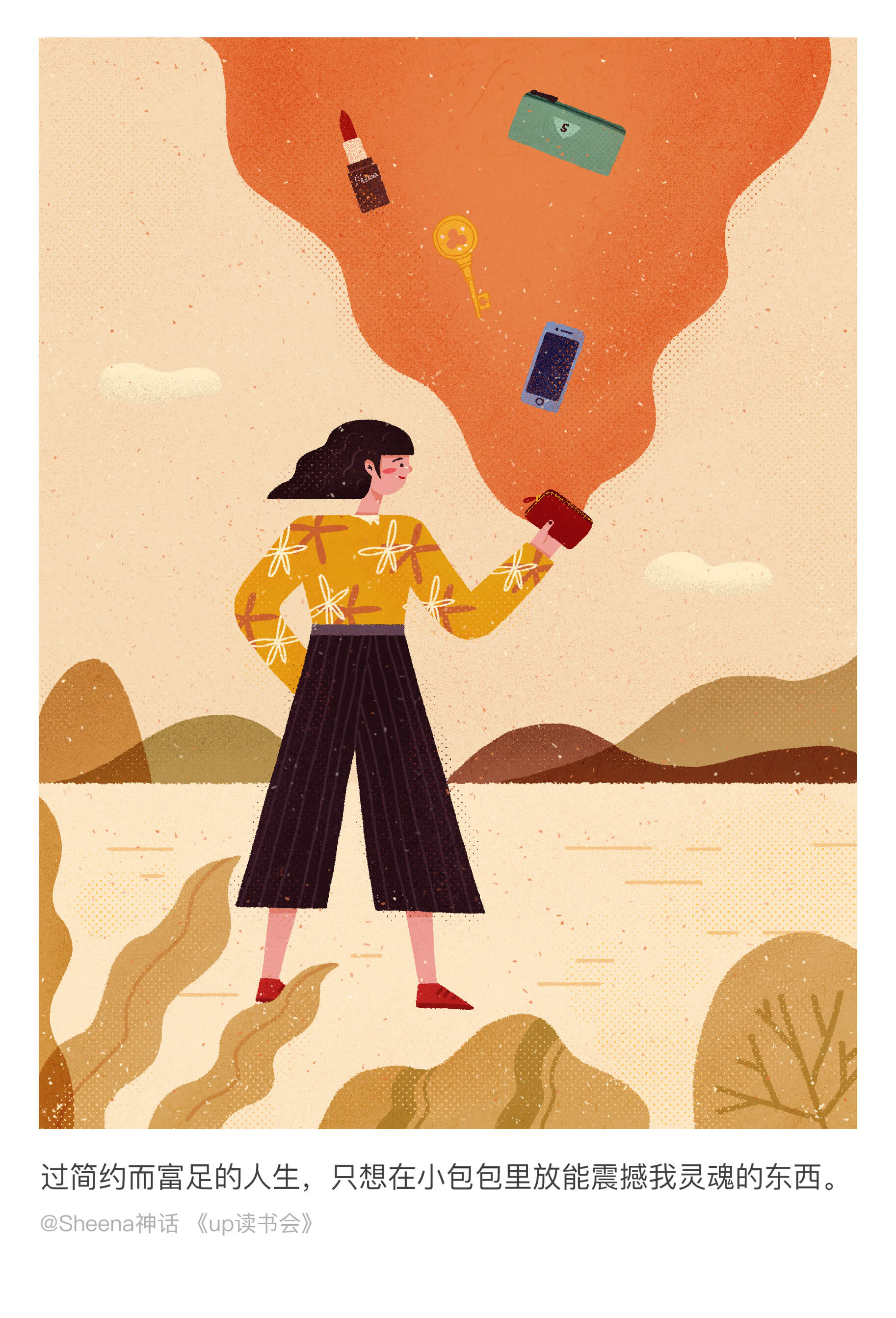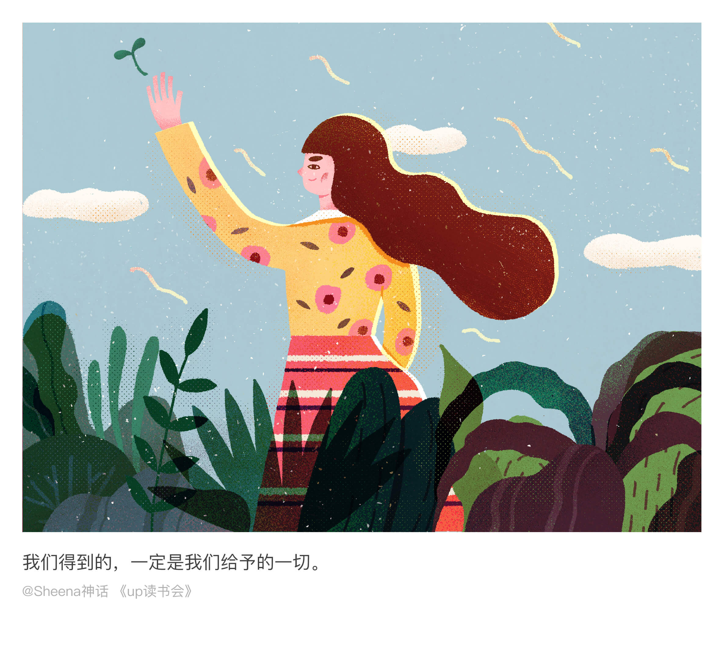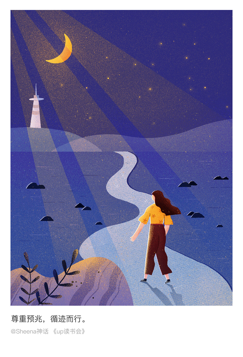 闯关计划最后十天是给文字配图。这一阶段,想把难度再提升一点。从创意,构思,想构图,到人物设计和色彩搭配,每一过程都经过精心的考量。就想出把读书会当中最美的文字表述成画面这样一个形式。是最艰难的一个阶段,因为你需要去思考用什么方式去表达这样一个文字,为了可以画到一个效果,找很多类似参考去研究,并而达到自己满意的状态。