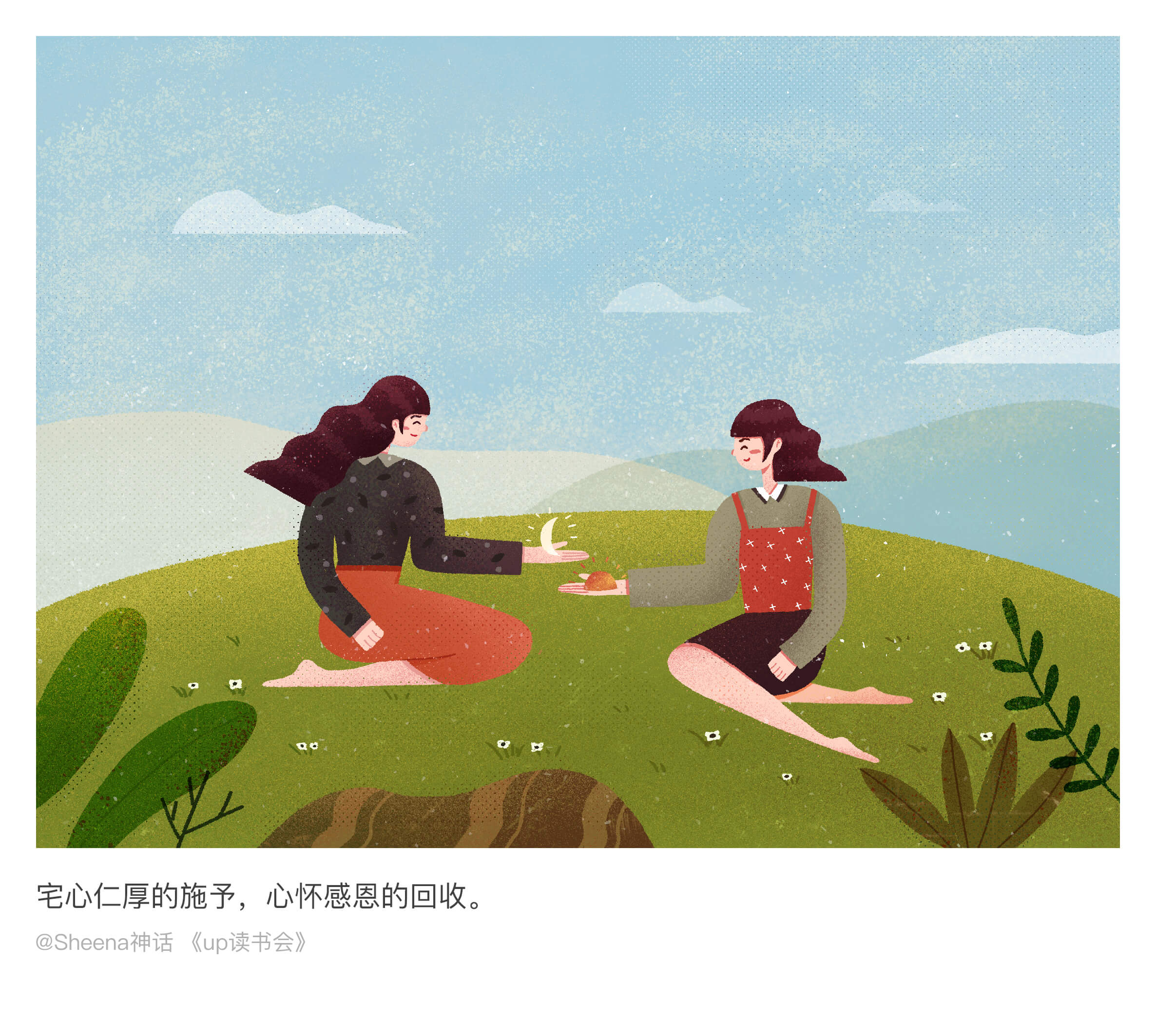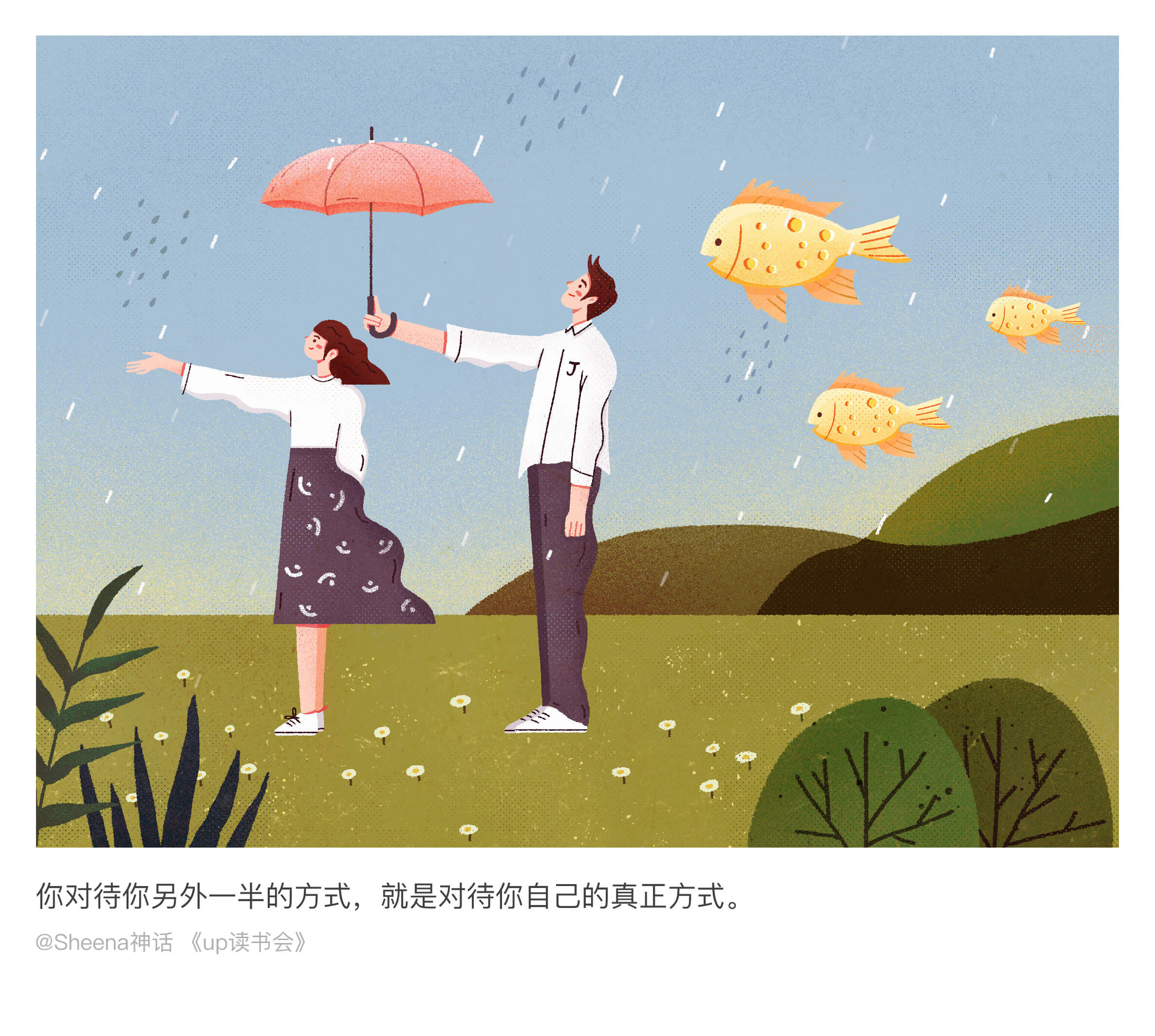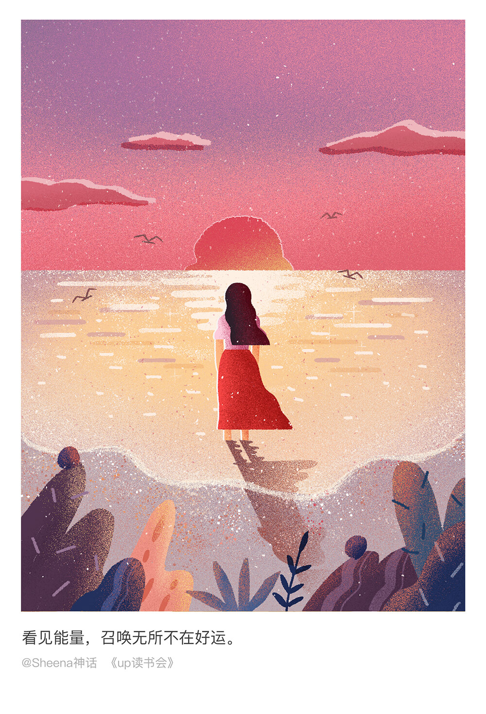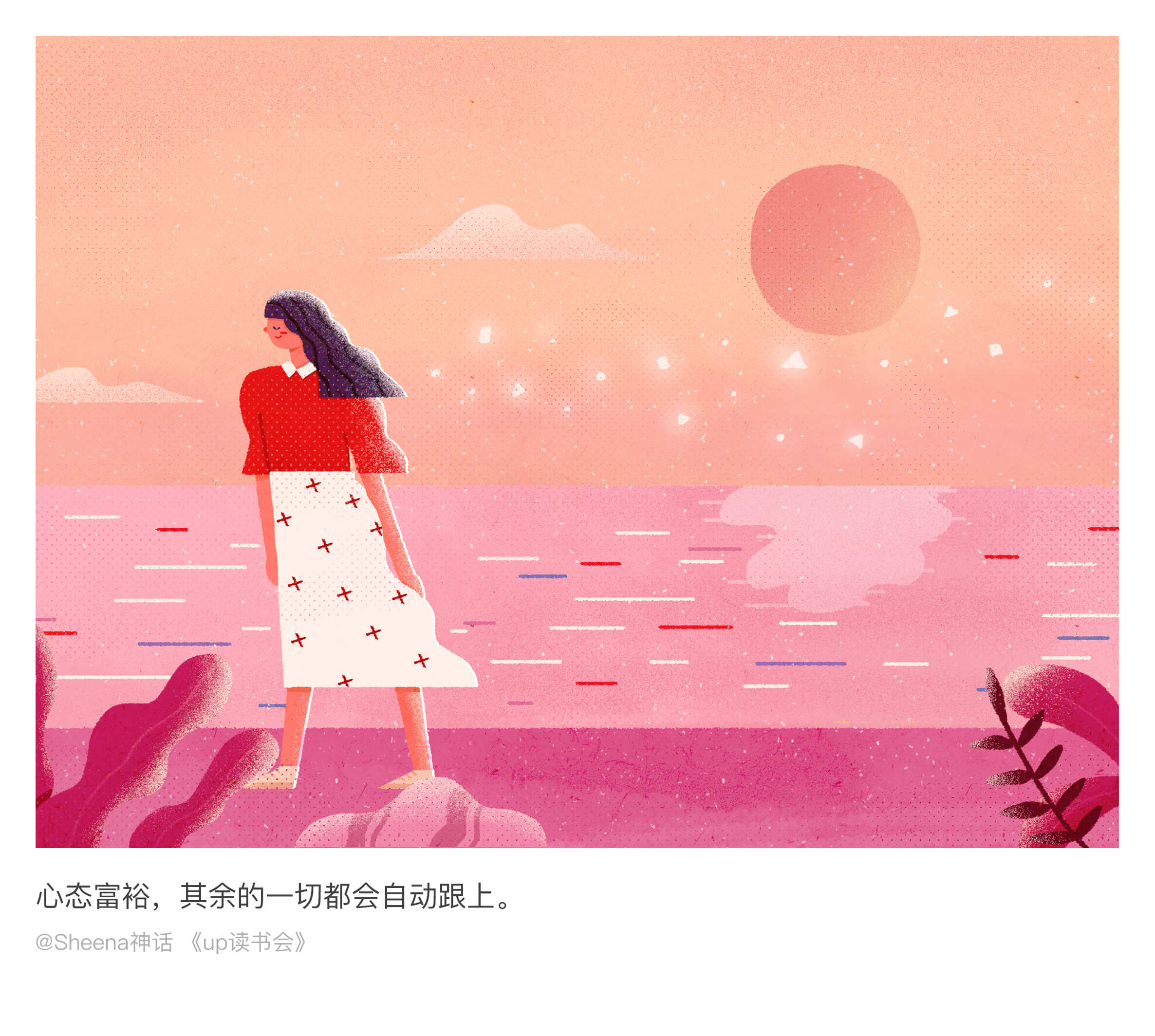 闯关计划最后十天是给文字配图。这一阶段,想把难度再提升一点。从创意,构思,想构图,到人物设计和色彩搭配,每一过程都经过精心的考量。就想出把读书会当中最美的文字表述成画面这样一个形式。是最艰难的一个阶段,因为你需要去思考用什么方式去表达这样一个文字,为了可以画到一个效果,找很多类似参考去研究,并而达到自己满意的状态。