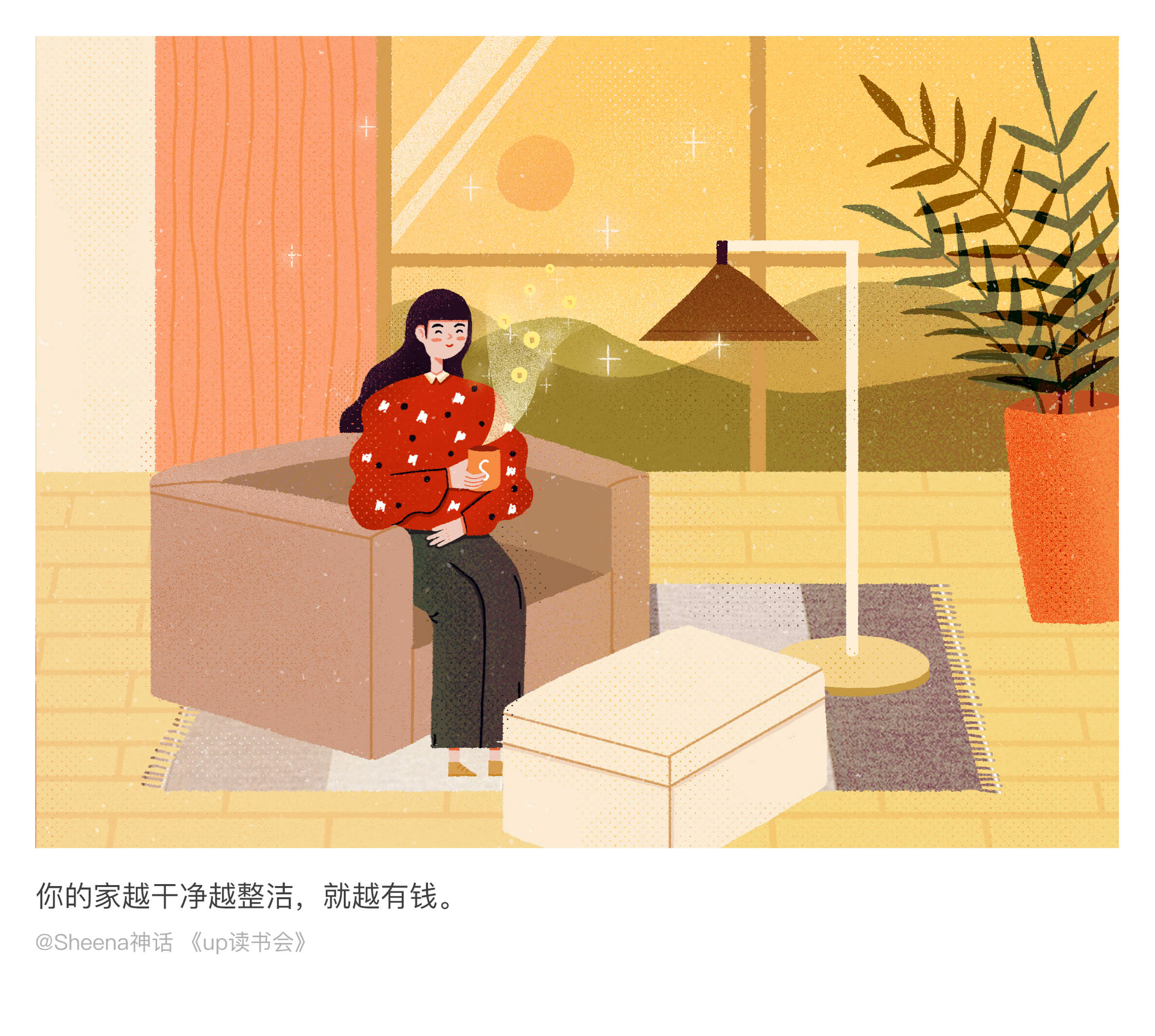 后来重新整理下心情,去想怎样表达会更好。干净的家,有光,温暖,整洁,有人,金钱,满意,知足,应该是这样一个场景。当思考比较完善的时候,画面也才会更加丰富。最后才画出比较满意的作品。
