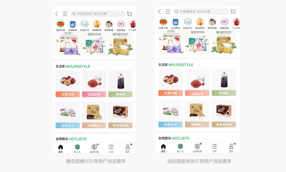 使用动效在吸引用户注意的同时,设定动效的播放顺序,可以引导用户逐个浏览完整个模块,增加用户在此处的停留时长。