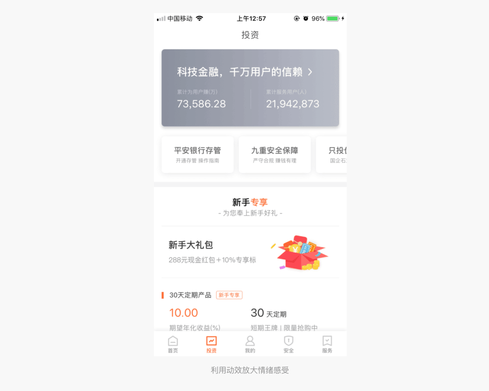 下图是我在之前求职一个金融平台时所做的面试题,对“我的”页面进行改版设计。对于一般的金融平台,用户一般进入“我的”页面都是想要查看收益,针对这一个用户需求点,我尝试着将动效和情感化结合起来,让数字快速翻滚,给用户营造一种“丰收感”,加以情感化的设计,用动态的笑脸表情给予用户一个正向积极的反馈,引导用户的情绪让其能更为强烈的感受到获得收益的喜悦,让用户在投资收益的过程中感受到“愉悦”以鼓励他们能够持续甚至加大投入来享受更多的这种愉悦感。