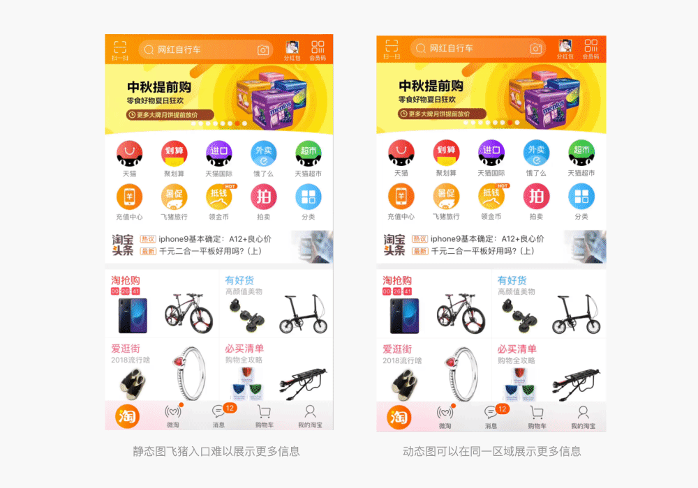 对于寸土寸金的手机屏幕来说,思考着如何能在局限的区域范围内去展示更多的信息,一直是平台运营者们想要攻克的难题,也是设计师们需要帮助解决的难题。拿淘宝APP的首页来说,其首页金刚区的每一个入口,里面所承载的功能,单拎出来都可以作为一个功能完整的APP来使用。由此可见其中所投入的人力物力,如果入口无法得到点击,那将会是多么巨大的资源浪费,因此引流这件事就显得尤为重要。但是单单一个入口图标+入口名称,如何才能明白地将入口的诱人亮点告知用户来吸引点击?