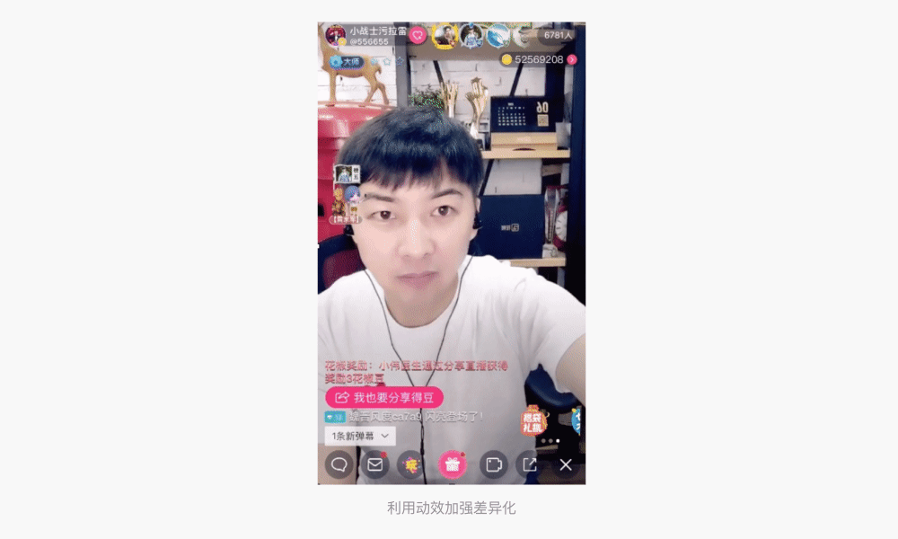一般来说,我们会给予高级用户「特殊性」。什么是特殊性?即高级用户的行为和一般用户的行为区分开来,做特殊的处理。就好比坐飞机的头等舱和经济舱,待遇是有差别的。下面举的例子是花椒APP的直播间,高级用户“小苔菜”进场时,其名字入场提示以动效的方式进入(普通用户入场提示则是在弹幕里和普通发言一样,很快被刷掉),这种特殊的对待方式可以让高级用户感受到其行为与普通用户的差别,让高级用户感受到自己的独特性,从而激励他们持续在平台进行消费以保持其高级的属性。