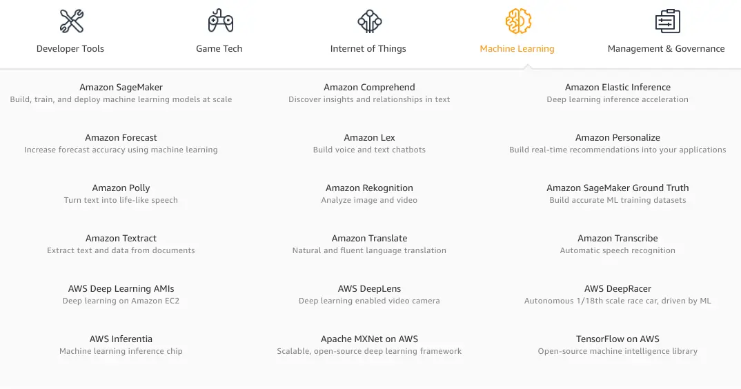 今年我们看到了更多的人工智能解决方案,它们被打包成一个 API 供软件工程师使用,这些工程师不需要有斯坦福大学机器学习博士学位的朋友在身边。Google Cloud 和 Azure 都改进了旧的服务并添加了新服务。AWS 机器学习服务列表开始变得让人觉着可怕。