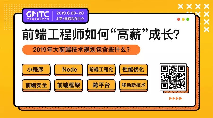 活动推荐2019 年大前端技术规划应该包含些什么?GMTC 全球大前端技术大会设置前端框架、前端工程化、Node、跨平台、小程序、前端安全、性能优化等 13+ 技术专场,给大家带来更多经验分享和思考。大会 7 折最低价火热报名中,点击“阅读原文”或扫描图中二维码了解大会详情,购票咨询:18514549229(同微信)