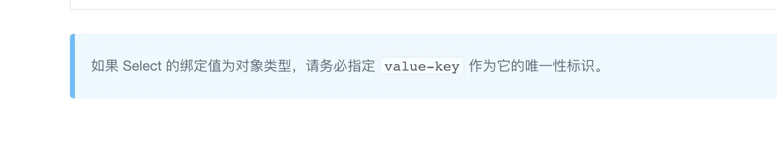 使用select时,有时后台查表浪费时间,会需要把select选中数据的id,name都传给后台。option的value绑定对象时,必需要给select绑定一个value-key,官方文档也有标注