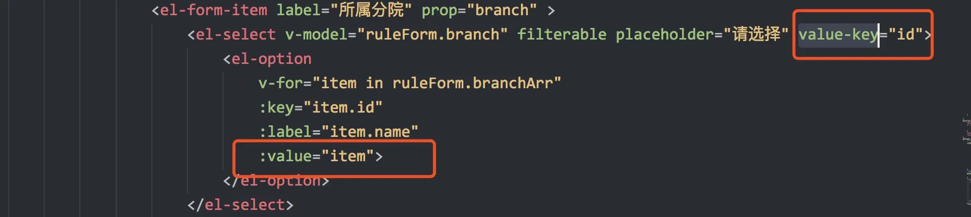 <el-select v-model="ruleForm.branch" filterable placeholder="请选择" value-key="id">