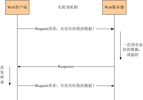 HTTP长轮询:客户端向服务器发送(http)Ajax请求,服务器接到请求后hold住连接,直到有新消息才返回响应信息并关闭连接,客户端处理完响应信息后再向服务器发送新的请求。
