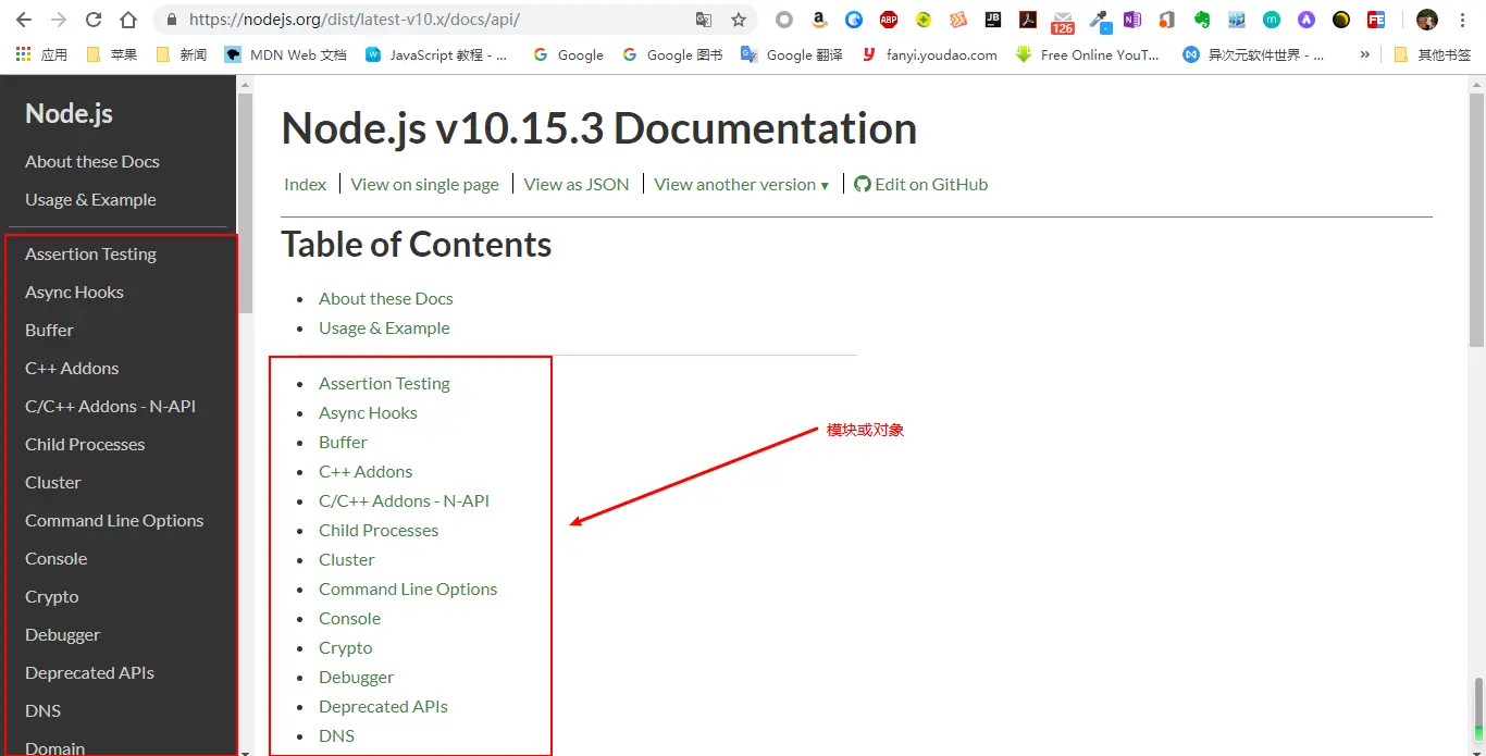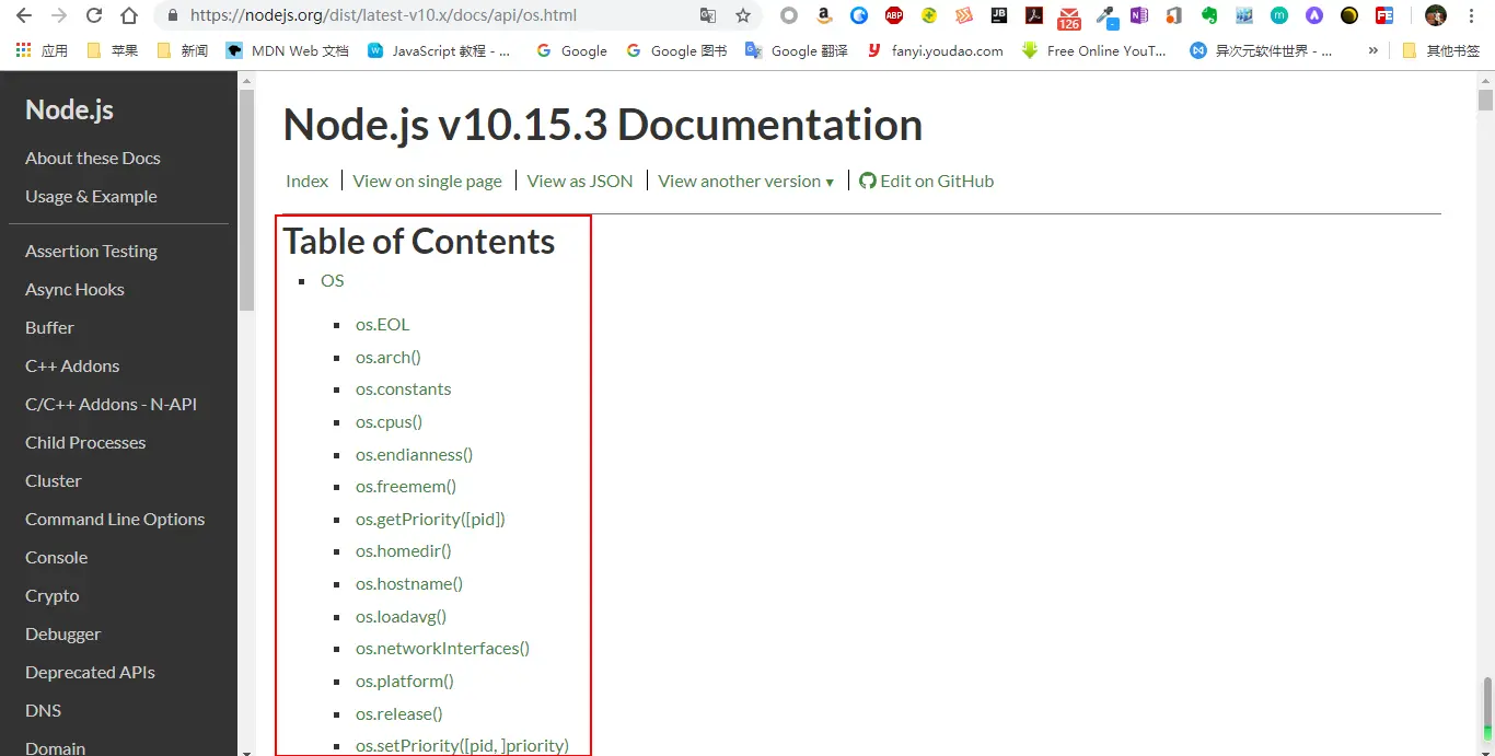 在node核心中有些内建模块,使用这些模块可以操作系统,文件和网络。打开nodejs.org官网可以看到文档中对应版本的API,推荐使用稳定版。