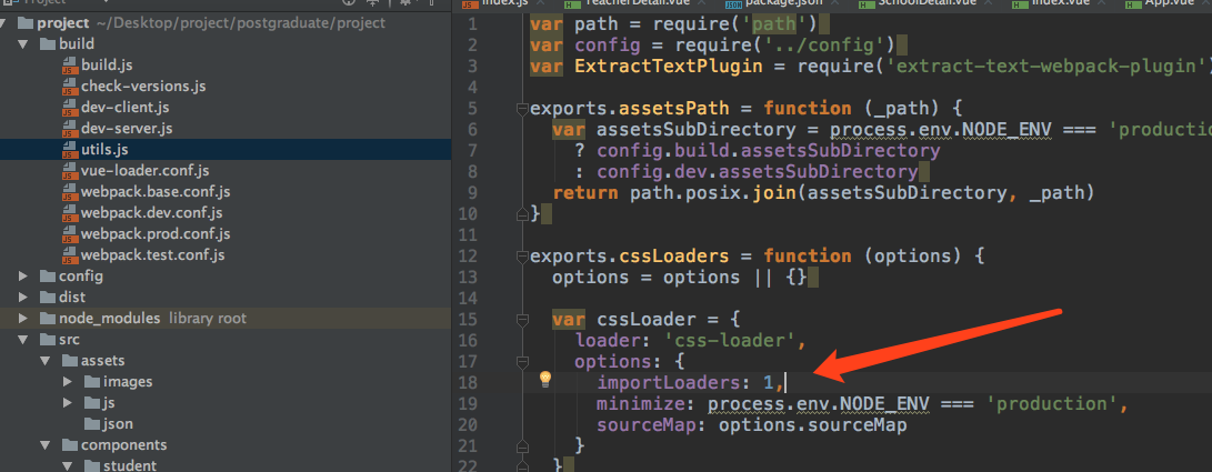 当然如果你使用的是@import引入css的话你还需要在utils.js中加入这句话 importLoaders: 1。