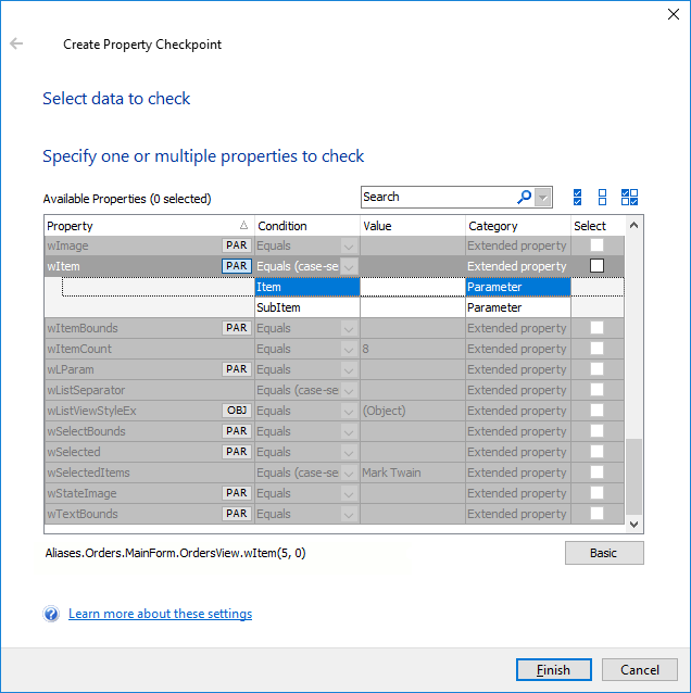 4、TestComplete将打开Create Checkpoint向导,该向导将显示对象属性列表。此列表包括TestComplete提供的属性以及测试应用程序定义的属性。例如,我们测试的应用程序是在C#中创建的,因此该列表包含相应.NET类的属性。