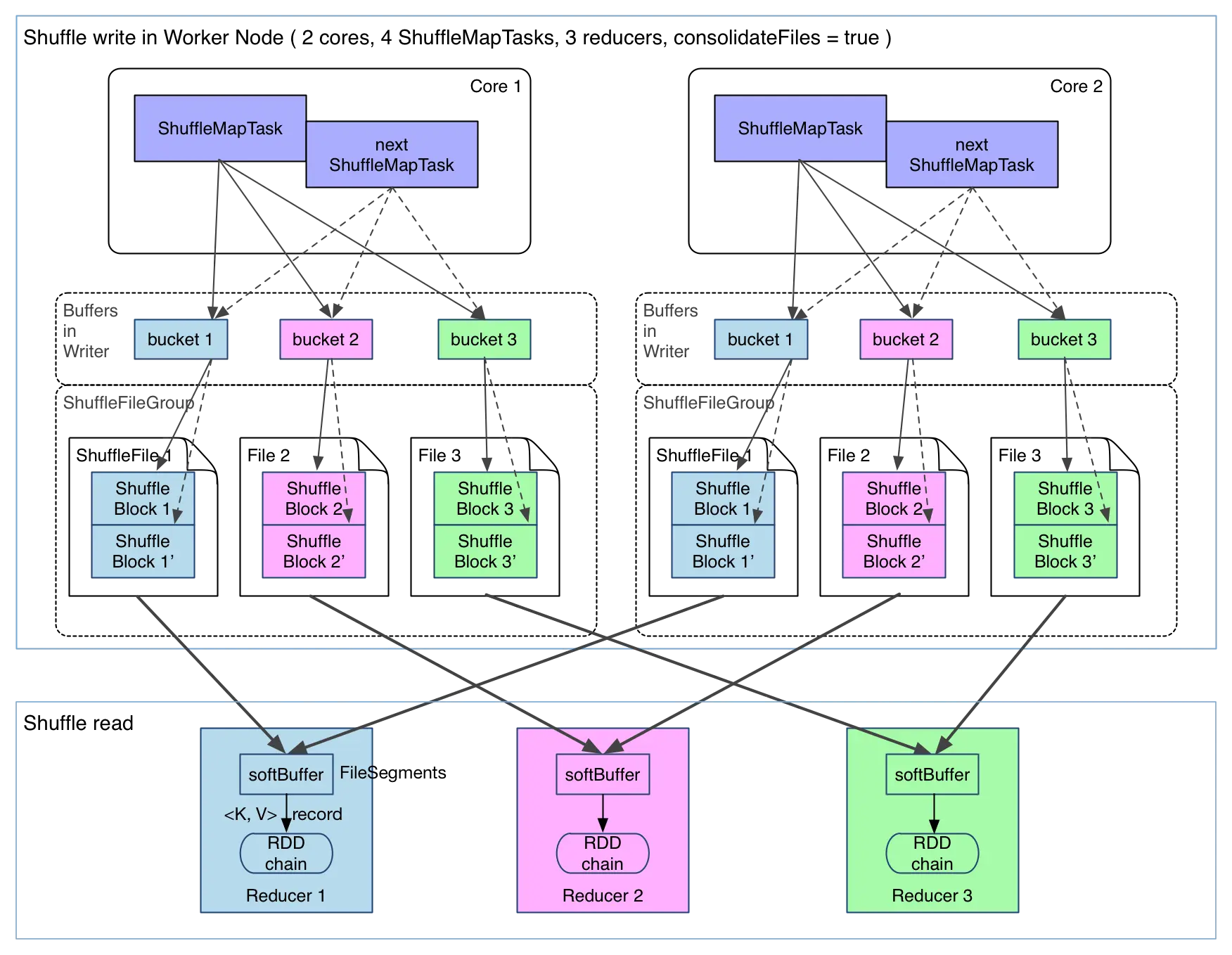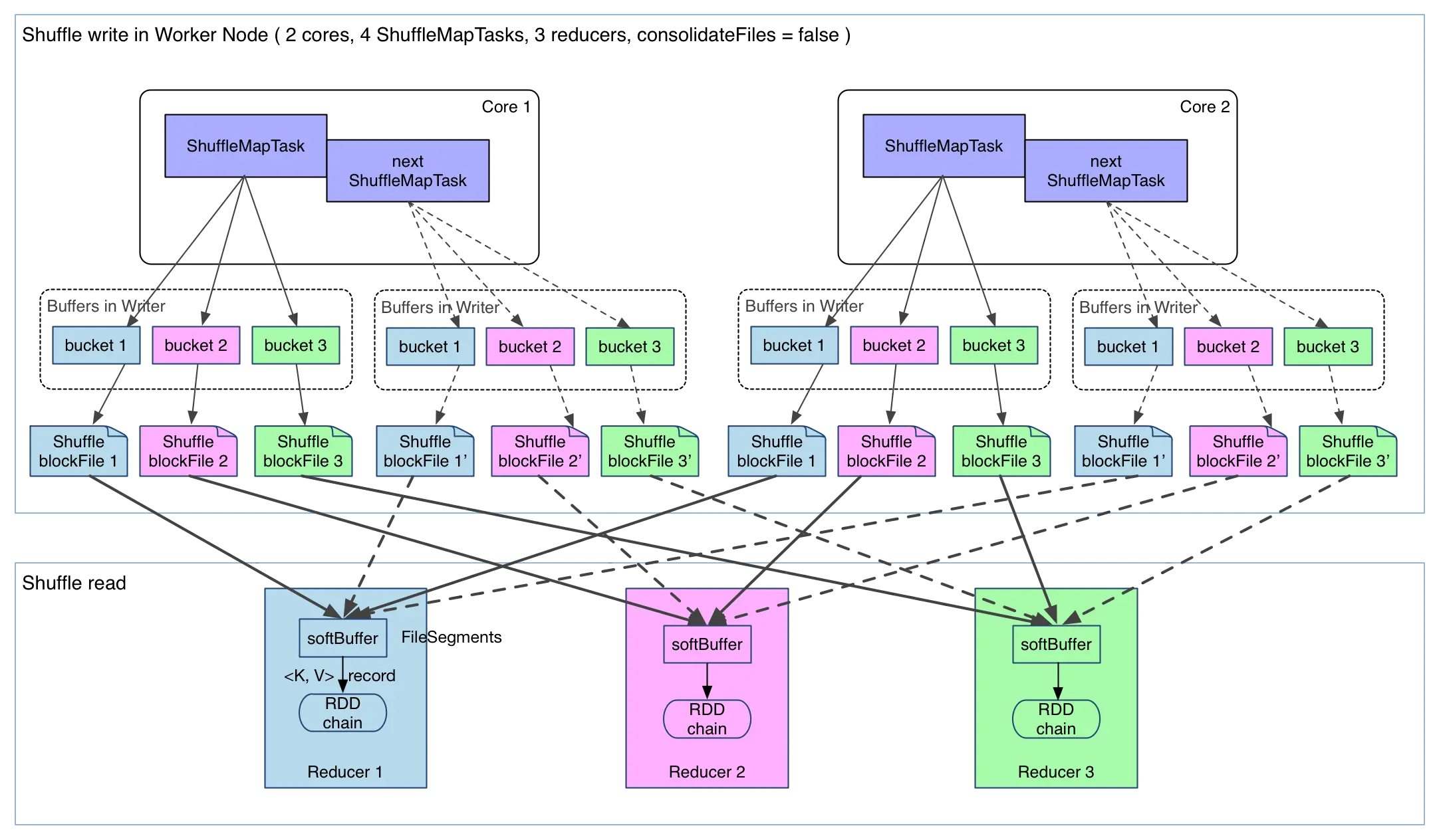 从上图我们可以看出,Executor中每个core对应的task在shuffle写的时候都会产生和下一个stage包含task数目一样的磁盘文件,也就是说下一个stage包含多少个task(即Reducer),当前stage的task就会产生多少个磁盘文件。那么100个单核的Executor,当前stage有200个task,每个Executor负责执行2个task,下一个stage有100个task,那么一次shuffle write需要产生200*100=20000个磁盘文件。每个buffer(即图中的bucket)的大小默认为32KB(Spark1.1中默认是100KB,可以通过spark.shuffle.file.buffer.kb来设置);在shuffle read阶段每个task从上一个stage中的每一个task中通过网络传输拉取相同key的数据进行聚合等shuffle操作。所以产生的磁盘文件越多,shuffle read的IO操作就越频繁,且大量的buffer将对Executor的存储空间产生巨大的压力。
