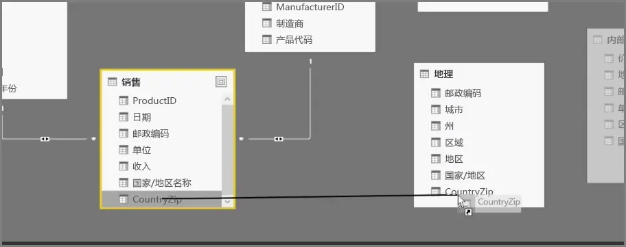 一旦在每个表中都创建了计算列,它们便可以用作关系键来建立它们之间的关系。继续转到关系视图,我们便可以将字段从一个表拖动到另一个表来创建关系了。