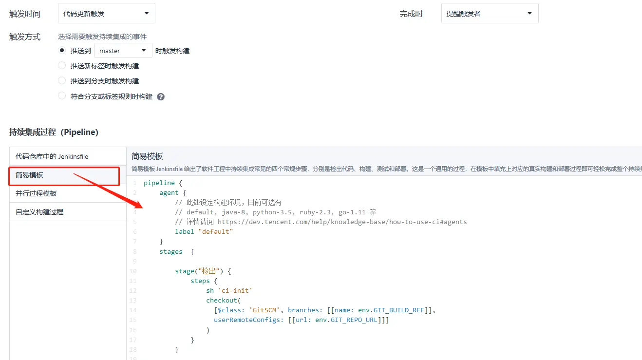 检出 这里不得不说,「CODING 持续集成」这里做的还是很方便的,提供了适用于好几种不同场景的模板。默认简易模板是带有检出部分的,我们可以根据实际情况进行修改。默认情况下,env.GIT_BUILD_REF 的值就是 master 主分支,实际上我们可以定制为其它专门用于构建发的分支。