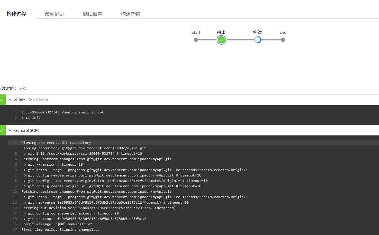 接下来, 平台会自动读取 Jenkinsfile 并开始走持续集成的流程: