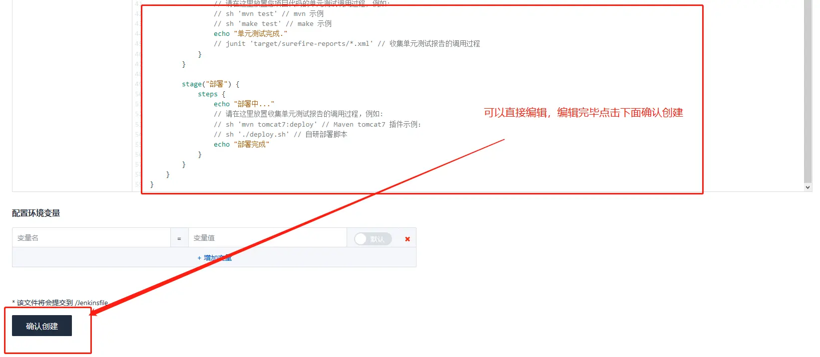 我们要保存 Jenkinsfile,编辑框可以直接编辑内容,编辑好可以直接提交到仓库下的 ./Jenkinsfile