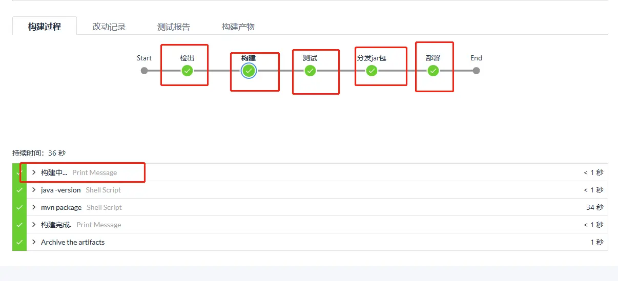 每个阶段都对应 Jenkinsfile 一个 stage, 我们可以点击查看对应阶段的构建结果。